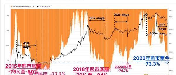 目前的跌幅達到了-73.3%,低于2021年11月的歷史前高,持續時間在227天到435天之間,這個熊市現在完全在歷史的規范和規模之內。