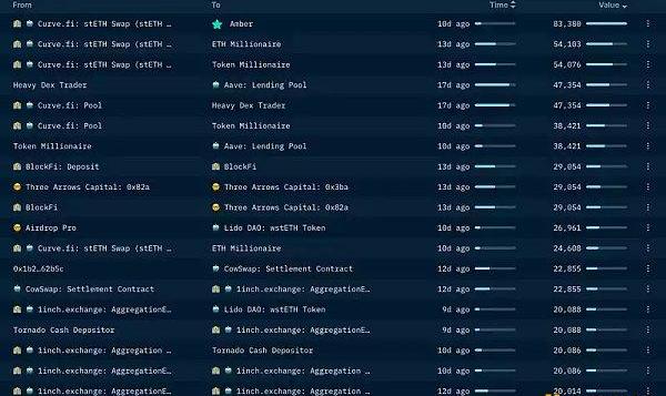 下表顯示了從6月3日到6月11日期間進行了大量stETH轉賬的前11個錢包,按時間順序排列: