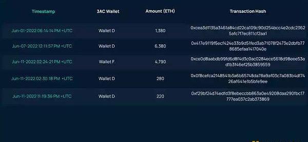 在6月1日到6月11日,我們看到共有?18050ETH從3AC轉移到Deribit,其中大部分是在6月7日后交付的。這些ETH存款進入衍生品可能被用作額外的質押品,以保護3AC當前的頭寸或采取新的頭寸,從而對沖3AC當前的投資組合。