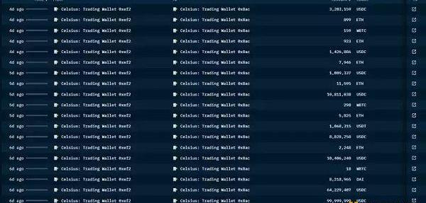此外,在6月8日至12日期間,Celsius使用錢包?A?從Compound和Aave借入USDC和USDT,并將資金發送到?錢包?E,可能是為了應付贖回。總計5950萬美元的USDC和200萬美元的USDT是在鏈上借入的。錢包?A?也取出了11.25萬ETH,并將其發送給錢包?E。