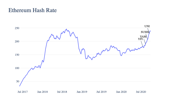 DeFi 的興起掀起了新的代幣浪潮,其中包括一些突破。ETH 在夏季的牛市恰逢 yearn.finance發行治理代幣 YFI。然而,這期間也出現了一些慘劇,例如,YAM 代幣經過暴漲后又歸零。下圖顯示了迄今為止,4 個大型 DeFi 代幣項目上線后 ETH 的價格走勢:YFI、YAM、SUSHI 和 UNI。
