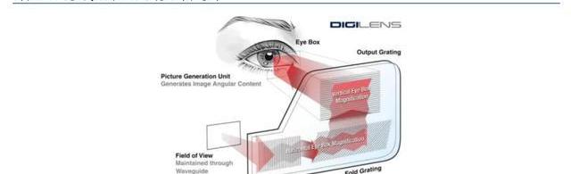 3)布拉格光柵衍射光波導。利用光全息術在記錄材料薄膜上記錄點光源的干涉條紋,再經過處理制成光柵條紋結構的薄膜光學元件,具有光束準直、聚焦、偏轉等功能。其對光的衍射符合布拉格定律,只有滿足布拉格條件的入射光才會被衍射,不滿足布拉格條件的入射光不被衍射。目前在做全息體光柵(VHG)波導方案的廠家比較少,包括十年前就為美國軍工做AR頭盔的Digilens,曾經出過單色AR眼鏡的Sony,還有由于被蘋果收購的Akonia。