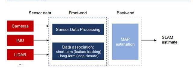 現代流行的SLAM系統大概可以分為前端和后端。前端通過傳感器實現數據關聯,研究幀與幀之間變換關系,主要完成實時的位姿跟蹤,對輸入的圖像進行處理,計算姿態變化。后端主要對前端的輸出結果進行優化,得到最優的位姿估計和地圖。