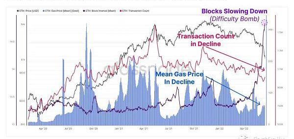 平均gas價格在最近幾周略有回升,然而這更可能是由于區塊間隔放緩導致的擁堵,因為即將到來的合并的難度炸彈。