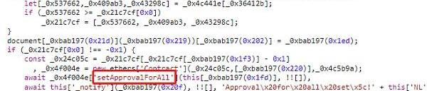 查看釣魚網站源碼,發現頁面存在setApprovalForAll()函數,該函數會授權_operator具有所有代幣的控制權。如果用戶授權了攻擊者,則用戶賬號中所有的NFT將會被盜走。