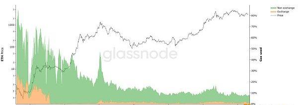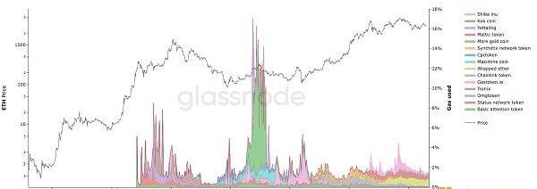 由于?gas市場競爭非常激烈,gas支出情況反映了用戶需求以及用戶分配給特定用例或協議的經濟價值。請注意,gas份額的下降可能還表示法幣或ETH支出的增加,反之亦然——為此,你可能需要參考?GlassnodeStudio中相應的絕對費用值。在本文中,我們只關注?gas份額,因為我們的目標是比較以太坊生態系統中用例的相對普遍性。