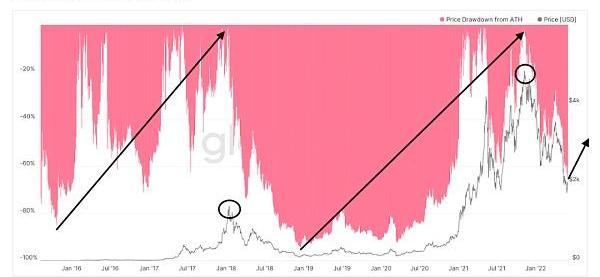 這是一張來自glassnode的圖表,幫助我概念化了三個主要的比特幣價格周期。在最大跌幅與前一個周期的歷史最高點相比,達到了一個局部底部。下面是一個代表三個主要周期的水平的表格。