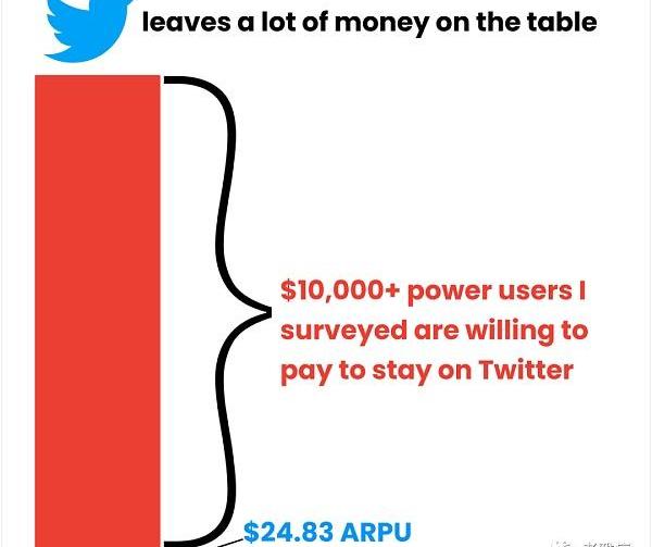 我不認為推特應該開始向超級用戶收取每年1萬美元的費用,但在Twitter目前收取的0美元和用戶愿意支付的1萬美元之間,Twitter可以向其用戶收費,以獲得更好的用戶體驗和獲得來自Twitter的更好的產品。