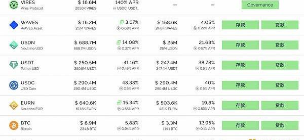 ViresFinance是Waves生態的一個借貸協議,允許WAVES、USDN、USDT、USDC、BTC、ETH等代幣間的借貸。數據顯示,ViresFinance中的USDN存款約有6.89億,借款只有2500萬,超過76%的USDN在ViresFinance中閑置,這部分USDN也可以獲得Neutrino的質押獎勵。