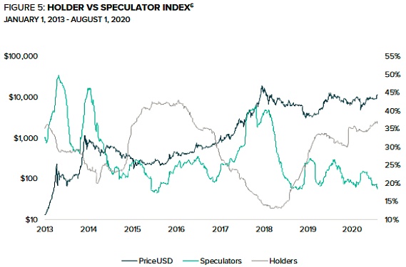 灰度以持幣者的持有時間區分市場結構。持有BTC 1到3年被定義為信仰者(Holder),90天內移動過BTC被稱為投機分子(Speculators)。