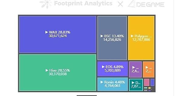 從各鏈來看,Q1公鏈GameFi總交易額$6.322B,排名前三公鏈分別為Harmony、Ronin和BSC。GameFi玩家聚焦于WAX、Hive、BSC和Polygon鏈,共占整個GameFi市場用戶的82.78%。WAX處于絕對領先地位,占各鏈總游戲交易量之和的77.7%。