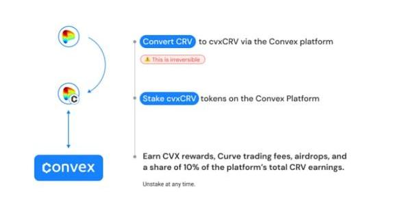 因此為了解決veToken流動性的問題,Convex應運而生。CRV的持有者可以在Convex上質押CRV并獲得cvxCRV,Convex平臺會自動將獲得CRV代幣在Curve上進行鎖倉從而獲得協議掌握的veCRV代幣,因此cvxCRV代幣也可以被稱為可流通代幣化的veCRV。在對cvxCRV的代幣進行質押后,用戶可以獲得Curve治理權,部分CRV流動性挖礦獎勵,50%的交易手續費,Convex原生通證CVX獎勵以及Convex提供的空投獎勵。