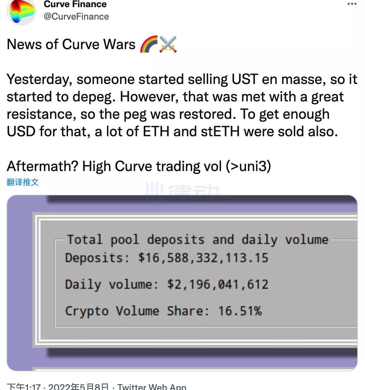 此時的UST因受到拋壓,已經出現了一定程度的脫錨,UST-3Crv池的流動性也開始傾斜,但LFG迅速出面救火,阻止了情況的進一步惡化。