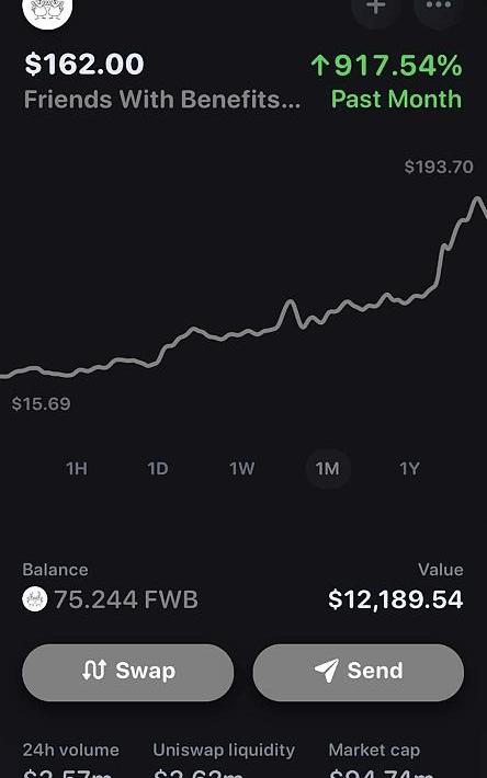 去年,FWB和WHALE進行了代幣交換(tokenswap),其中$FWB的股份價值為10萬美元。今天,這些股份已經價值150萬美元了。