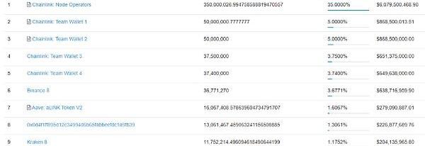 Chainlink持有量前10的地址持有近60%的代幣。資料來源:etherscan