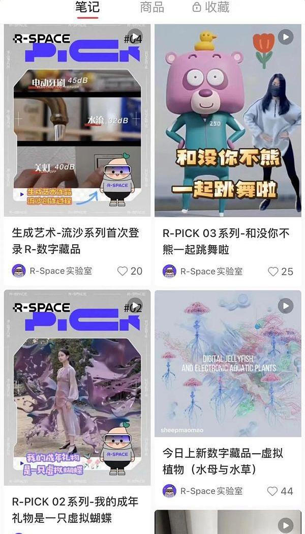 在小紅書上,這些虛擬時裝都關聯著一個開設了3個月的賬號@R-Space實驗室——該賬號作為小紅書關于數字藏品的官方發聲渠道,不僅會定期更新數字藏品最新售賣企劃,還會不定期提供數字藏品以及合作的相關原創藝術家和作品的科普。