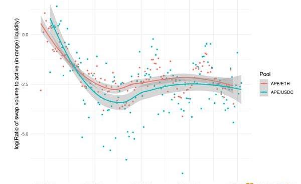 我們看到APE/ETH池中的費用應計在一致性和平均收取費用的絕對數量方面略優于APE/USDC中的費用應計。然而,差異相當微不足道,這表明流動性供應的隱含市場使兩個池之間的費用與TVL比率保持相對相似。請注意,該指標中隱含了幾個不同的因素:交易量、提供的整體流動性數量以及實際在范圍內提供的流動性的比例。