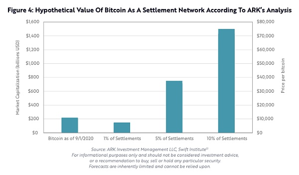 盡管它在成長,但我們的分析表明,比特幣在貨幣化的道路上還處于早期,還有很大的升值潛力。在我們看來,比特幣2000億美元的市值--或者說網絡價值--在未來十年內將會有超過一個數量級的規模,達到萬億級別。