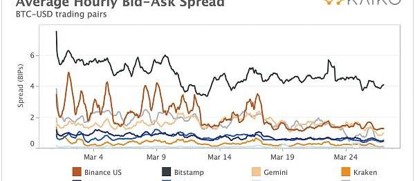 BTC-USD貨幣對的買賣價差在經歷了2月和3月初的波動后,已經恢復了。幾乎所有的交易所,每小時的平均價差都下降了。Bitstamp和Binance.US的改善幅度最大,價差分別從6個基點下降到4個和4個下降到2個。其他交易所隨著市場的恢復和持續收益,流動性更加穩定。