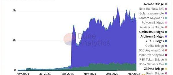一個重要的部分是跨鏈橋。橋允許用戶從L1->L2移動代幣。橋協議在2021年實現了巨大發展。如果跨鏈橋HopProtocol啟動代幣/空投,預計這會變得更大,我們看到交易所Coinbase等正在提供更好的橋支持。