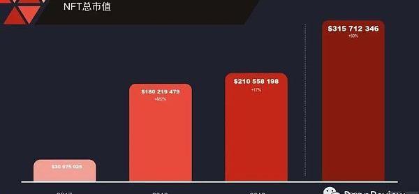 根據DappReview《2019NFT年度報告》數據顯示,2020年NFT的市值與交易玩家數據均有了大規模上漲。根據DappReview的數據,NFT的總市值從2018年的1.8億美元,上升到了2019年的2.1億美元,預計2020年將增長到3.15億美元。