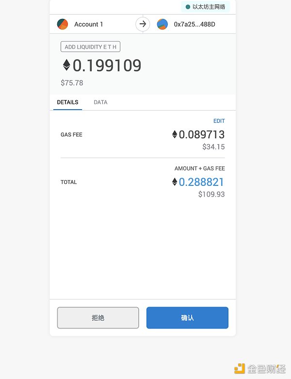 8.點擊Swap,然后相繼確認交易,在調起的MetaMask的確認頁面,確認支付gas費,因為交易gas過于高額,所以我點擊了edit按鈕,選擇了更便宜一些的gas費,最低gas費和最高手續費相差了14美金(最后打包的gas費不一定有那么高)。確認后,主頁右上角會出現pending標簽,是交易確認中,可能需要等待時間比較長,最低gas費大約20分鐘。(因為網絡情況也會出現長時間延遲,本文中等待了2個小時未確認)。