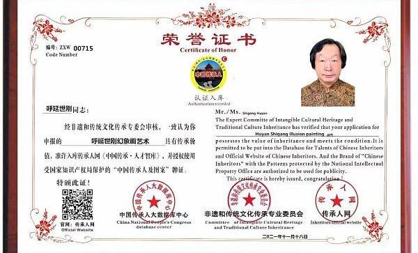 2021年11月18日,經中國傳承人大數據庫中心非遺和傳統文化傳承專業委員會審核,認為北京市呼延世剛同志申報的“呼延世剛幻象畫藝術”具有傳承價值,符合申報條件,準許入庫傳承人網《中國傳承·人才智庫》,并授權使用受知識產權保護的“中國傳承人及圖案”牌證。