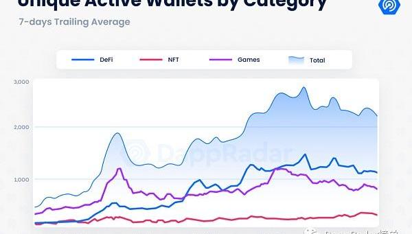在持續的加密貨幣熊市中,自去年11月以來,加密貨幣下跌了50%,而在緊張的全球形勢下,該行業的使用量比前一個月下降了5%。因此,2月份平均每天有235萬個UAW連接到dapp。另一方面,這也可以提醒我們,與2021年2月相比,該行業增長了385%。