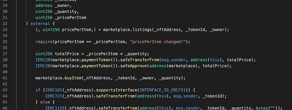 可以發現若傳入的_quantity參數為0,則可以直接通過require(listedItem.quantity>=_quantity,"notenoughquantity");檢查并進入下面的轉移NFT流程,而其中沒有再次對ERC-721標準的NFT轉移進行數量判斷,使得雖然傳入的_quantity參數雖然為0,但仍然可以轉移ERC-721標準的NFT。而計算購買NFT的價格的計算公式為totalPrice=_pricePerItem*_quantity,因此購買NFT的價格被計算為0,導致了在市場上的所有ERC-721標準的NFT均可被免費購買。