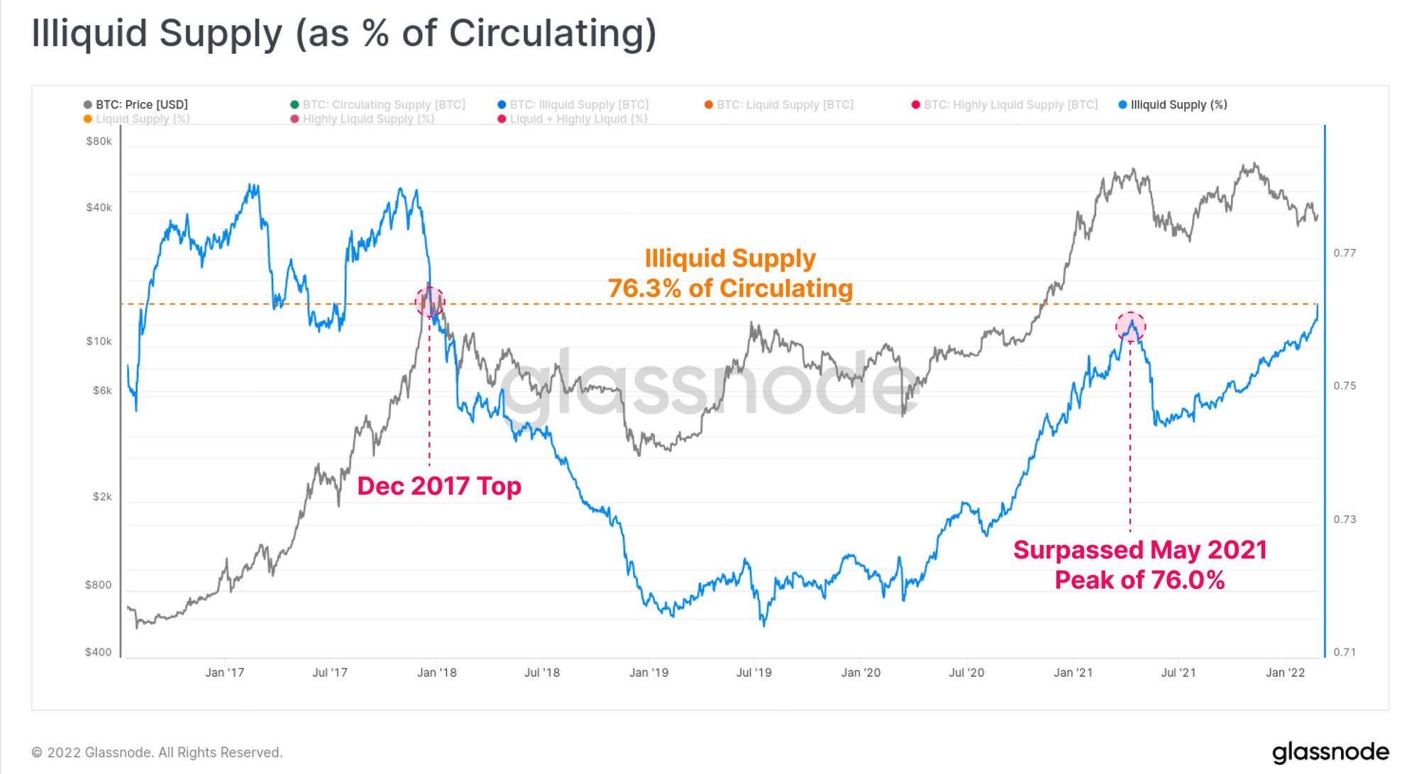 非流動性供給占流通供給的比例已超過2021年5月的峰值,達到76.3%。這現在已經回到了與2017年市場頂部相同的水平,扭轉了長達四年的代幣錢包流動性的增長。然而,請注意,這兩種情況都發生在重大拋售事件之前,因此這些這些代幣是否真的處于冷藏狀態,還有待觀察。