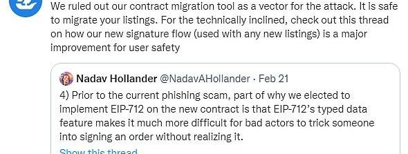 根據OpenSea官方的回復,本次事件由黑客趁著OpenSea合約升級之時,給所有用戶的郵箱發送了一封釣魚郵件,而不少用戶錯把其當作官方郵件而將自己的錢包授權,進而導致錢包被盜,目前OpenSea已經排除了合約遷移工具是攻擊載體的可能性。?OpenSea的聯合創始人兼首席執行官DevinFinzer發推說攻擊者竊取了價值?170萬美元的以太幣。