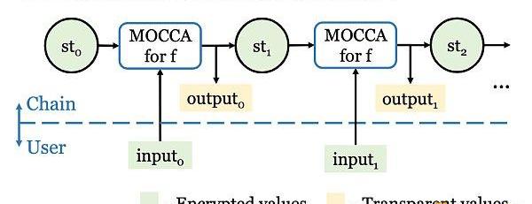 直觀地說,MOCCA為狀態轉換函數f提供了可能的最佳隱私。它們可以在鏈上計算,給定必要的加密輸入,并且計算應該產生一個加密的和更新的狀態,以及一些透明的輸出值。具體來說,程序的狀態和輸入被加密到鏈上,這樣一來,唯一可以進行的共識操作就是計算狀態的轉換,這意味著只有應用意圖的信息被解密并變得透明。暫時假設我們有這樣一個魔盒,那么就很容易復制鏈上應用程序的功能,同時提供隱私屬性。因為應用設計者可以設計他們的應用,只發布相關的信息作為透明的輸出,如現貨價格或儲備金額。