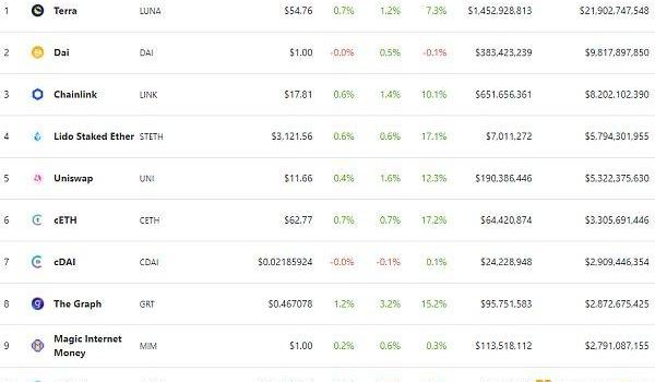 DeFi項目鎖定資產前十排名及鎖倉量數據來源:defillama