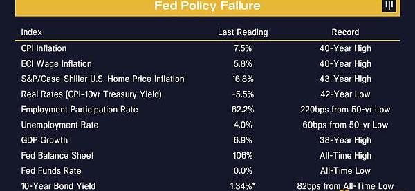 歷史上從未有過年通脹率為7.5%且聯邦基金為零的時期。這種政策組合顯然是錯誤的。從現在起五周后是否加息有很多爭論。他們應該在五個月前或今天加息。當我開始擔任債券交易員時,美聯儲是實時行動的。沒有這種“前向引導”的戲劇。