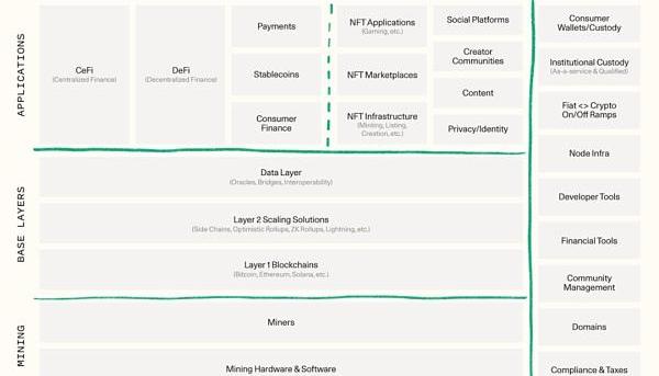 3.加密的興起需要一個新的加密堆棧。從核心基礎設施到開發人員工具,一些傳統堆棧可以轉換,而另一些則不會。托管、節點、法定加密貨幣以及鏈上和鏈下數據只是新興加密堆棧的幾個領域。在這個時代,價值可能會累積到新的層次。在傳統軟件中,應用層產生了更多價值,而在加密貨幣中,核心協議可通過代幣貨幣化