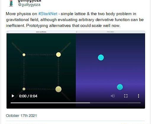 真正的游戲規則改變者將是?L2網絡中的那些獨特和創新的應用,這些應用在L1網絡上甚至不可能部署。比如,我們已經在Twitter上看到了?@guiltygyoza?已經在以太坊L2網絡StarkNet上面構建了物理引擎和3D模型(見下圖)。從長遠來看,用戶將會使用Rollups,因為Rollups在各個方面都遠遠優于L1網絡。從短期來看,開發者的采用和Token激勵措施對于L2吸引新用戶可能是有效的。?