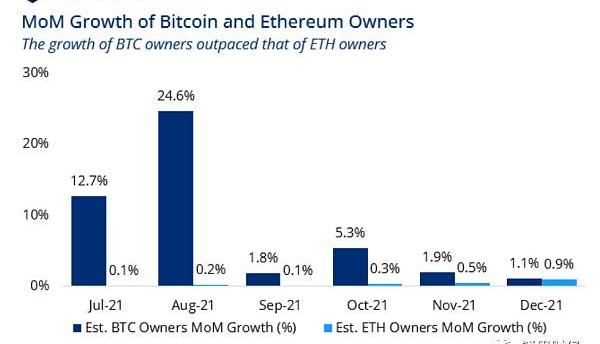 而當分析比特幣和以太坊用戶時,Crypto.com發現了有趣的細節。比特幣用戶從7月份的1.28億增長到了12月的1.76億,5個月增長了37.5%;而以太坊用戶一直維持在大約2300萬左右,其用戶比例在此期間僅增長了1.4%。