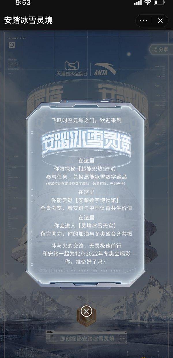 “靈境冰雪天宮”板塊將于1月25日上線。1月25日零時至2月4日活動期間,安踏還將發布2款2022年特別紀念版高能冰雪數字藏品。