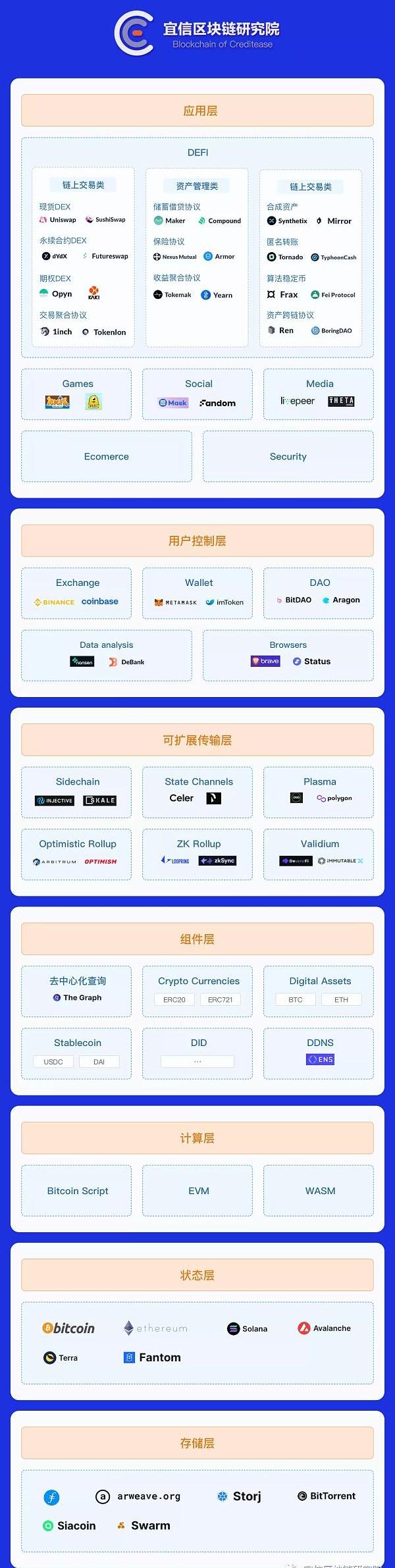 根據Web3.0的發展現狀,及我們對Web3.0的理解,宜信區塊鏈研究院也梳理了一個Web3.0的核心技術堆棧全景圖: