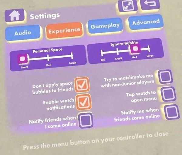 EchoVR則教新用戶如何將其他玩家靜音并設置個人氣泡,讓他人在氣泡之外無法近身,它也允許改變聲音和音調從而掩飾性別。