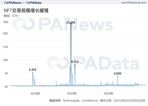 但是,從2017年以來的NFT市場交易情況來看,幣本位交易規模增長趨勢十分緩慢,即使今年下半年NFT概念被熱炒后,其整體幣本位交易規模也沒有表現出明顯的擴大。