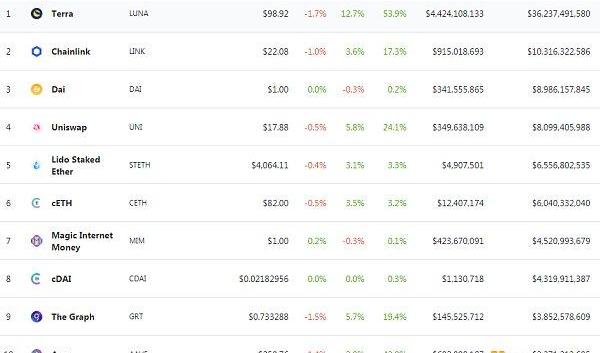 DeFi項目鎖定資產前十排名及鎖倉量數據來源:defillama
