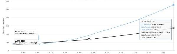 通過定期存儲MPT,狀態的存儲大小顯著減少。據Etherscan數據,目前Geth全節點的區塊鏈數據大小約為1TB。