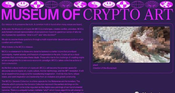 M○C△–加密藝術博物館–最初于2020年4月開始,是朋友和加密投資者ColbornBell和PabloRodriguez-Fraile之間的合作。他們想展示一個通過獨特的以藝術為重點的NFT收藏品策劃的與加密貨幣文化相關的頂級收藏品。在藝術史學家ShivaniMitra和建筑師DesireeCasoni的幫助下,博物館在2020年收集了來自Beeple、Pak、Osinachi、Hackatao、Fewocious等頂級加密藝術家的藝術作品。完整收藏品存儲在ENS地址museumofcryptoart.eth。