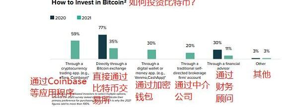 在此期間,投資者購買比特幣的渠道也發生了變化。在2020年時,有超過四分之三的投資者更喜歡直接通過比特幣交易所購買。而在2021年,近三分之二(59%)的投資者表示更喜歡通過加密貨幣交易應用來購買比特幣,只有超過三分之一(35%)的投資者表示傾向于直接通過交易所購買比特幣。