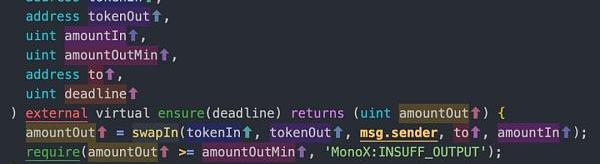 這里攻擊的核心是在Monoswap.sol中的swapExactTokenForToken函數,攻擊者傳入MONO代幣使得tokenIn和tokenOut是相同的代幣。
