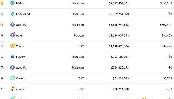 BSC鏈上DeFi鎖定資產前十排名及鎖倉量,數據來源:Debank