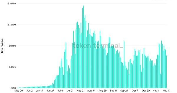 區塊鏈數據分析公司tokenterminal數據顯示,AxieInfinity的游戲收入在今年7-8月份達到峰值,當時其日收入通常超過1000萬美元。而近兩個月,游戲整體收入顯著下降,11月14日,該游戲總收入為690萬美元,僅相當于高峰時期的一半左右。