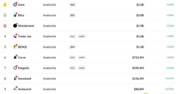 Avalanche鏈上DeFi鎖定資產前十排名及鎖倉量,數據來源:Debank
