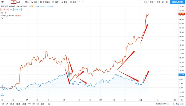 因為比特幣和股市的聯動有時候是同漲同跌,有時候卻是異步反向的,例如NDX100(納斯達克)曾經和比特幣的正向聯動,最近一段時間卻出現了反向聯動。